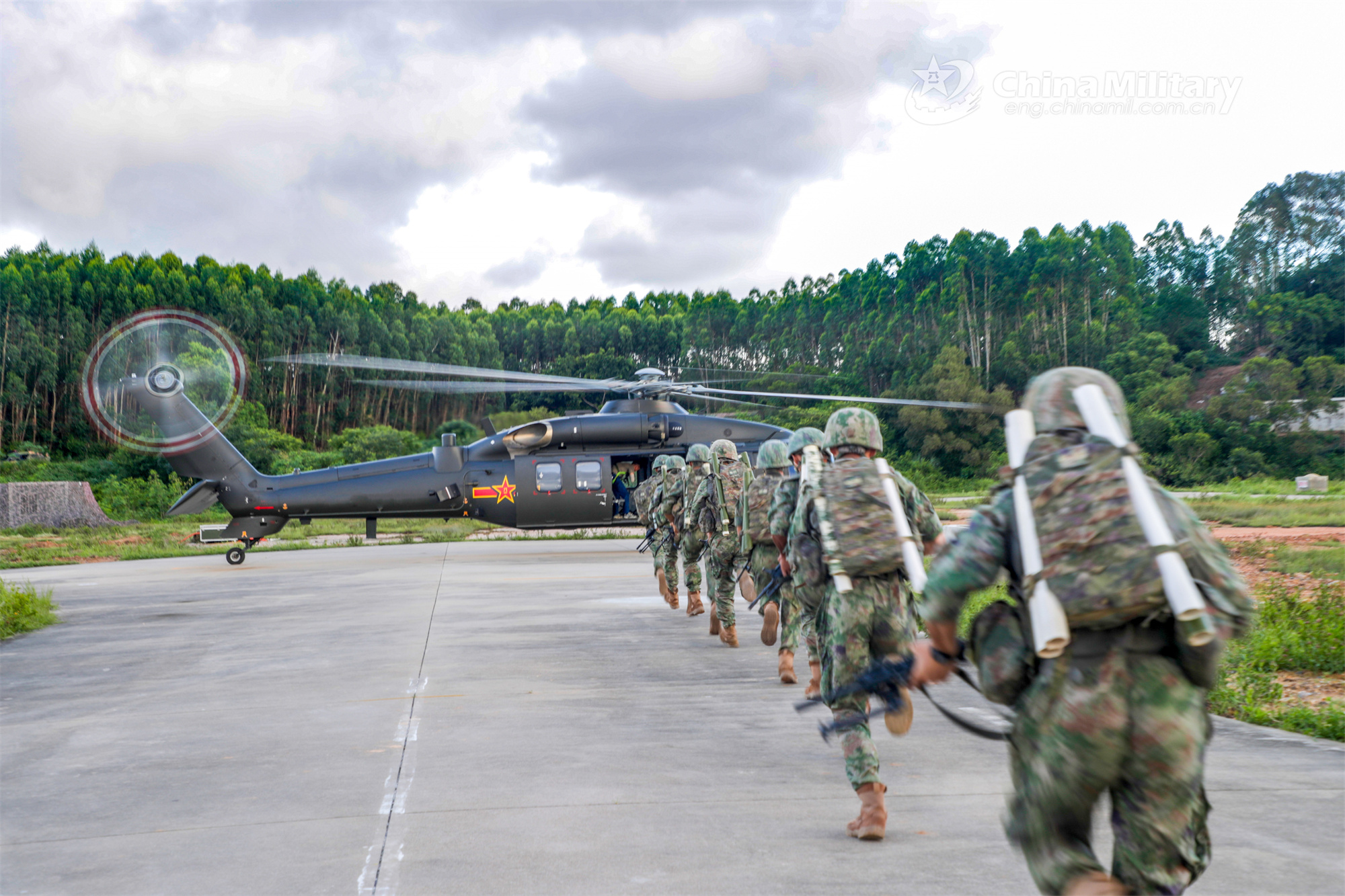 Soldiers assigned to an army brigade run into a transport helicopter during a seizure-and-control training exercise held in early August. (eng.chinamil.com.cn/Photo by Zhou Shiyu)