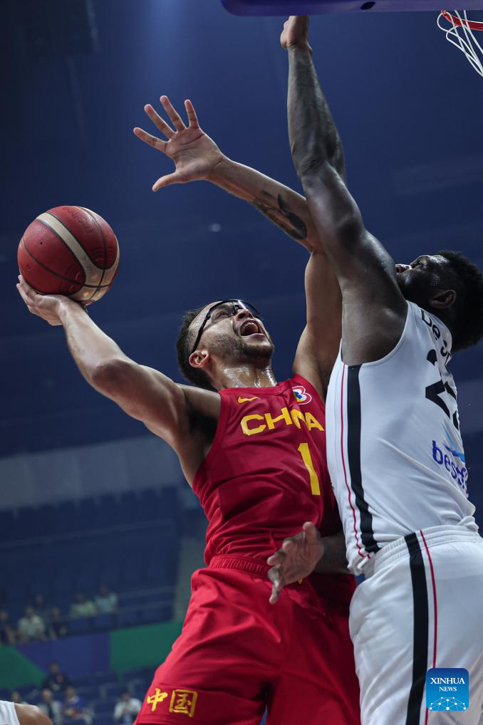 Zhang Zhenlin (Top) of China competes during the classification round 17-32 match between China and Angola at the 2023 FIBA World Cup in Manila, the Philippines, on Aug. 31, 2023. (Xinhua/Meng Yongmin)
