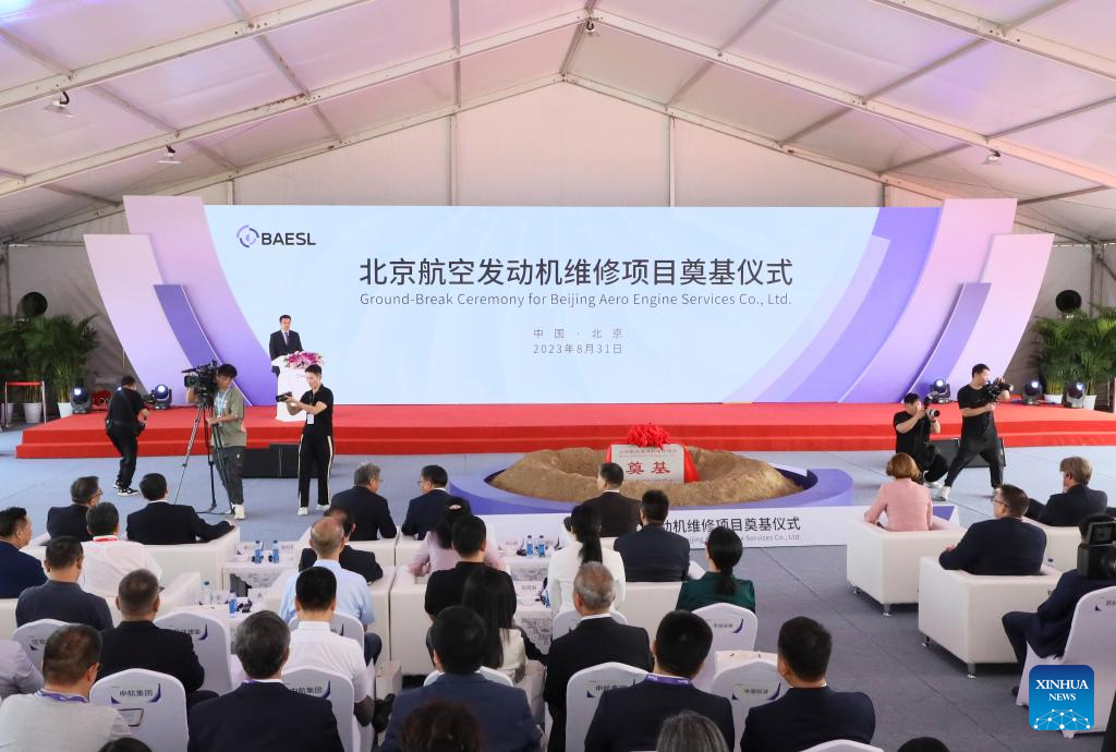 This photo taken on Aug. 31, 2023 shows the ground-breaking ceremony for Beijing Aero Engine Services Company Limited in Beijing, capital of China. (Air China/Handout via Xinhua)