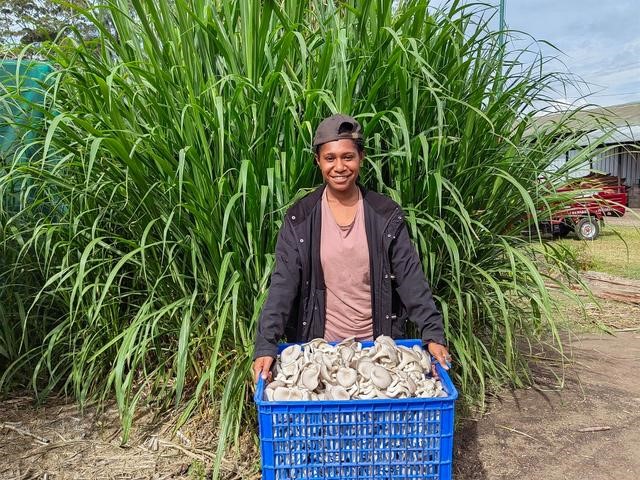 A farmer in Papua New Guinea poses for a picture with the mushrooms cultivated with Juncao grass. (Photo courtesy of the China National Engineering Research Center of Juncao Technology)