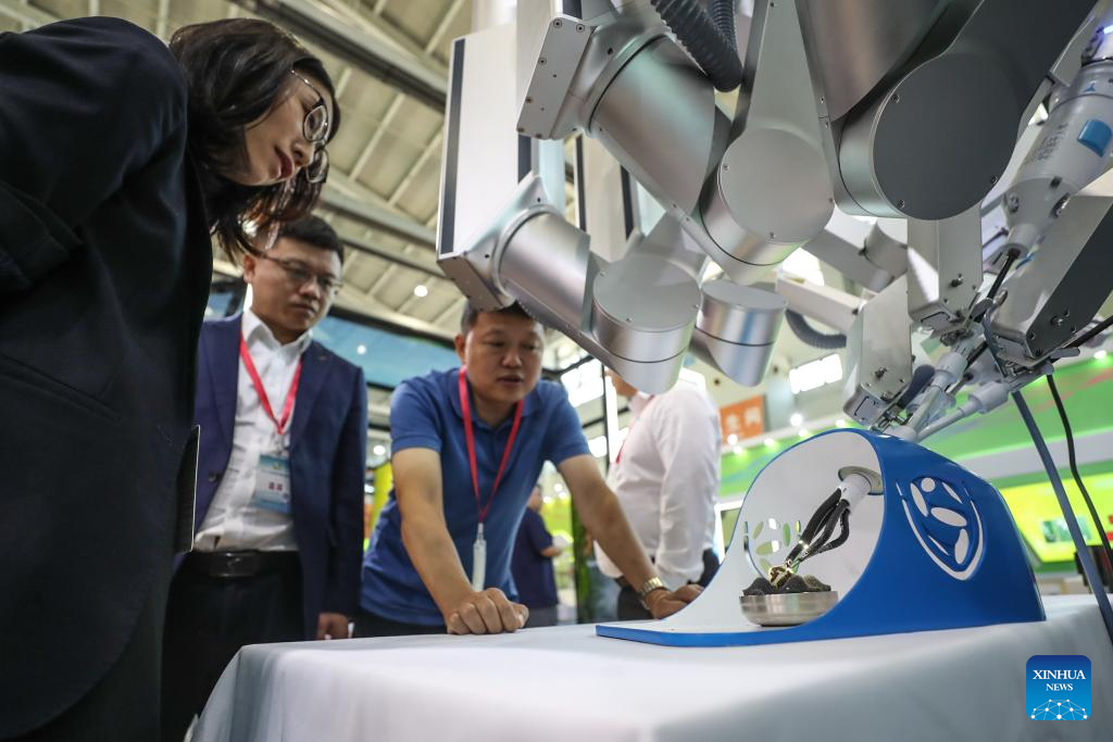 Visitors view a piece of equipment for single incision laparoscopic surgery displayed at the 21st China International Equipment Manufacturing Exposition in Shenyang, northeast China's Liaoning Province, Sept. 1, 2023. The expo kicked off on Friday at Shenyang International Exhibition Center. Over a thousand enterprises in intelligent manufacturing area attended the expo. (Xinhua/Pan Yulong)