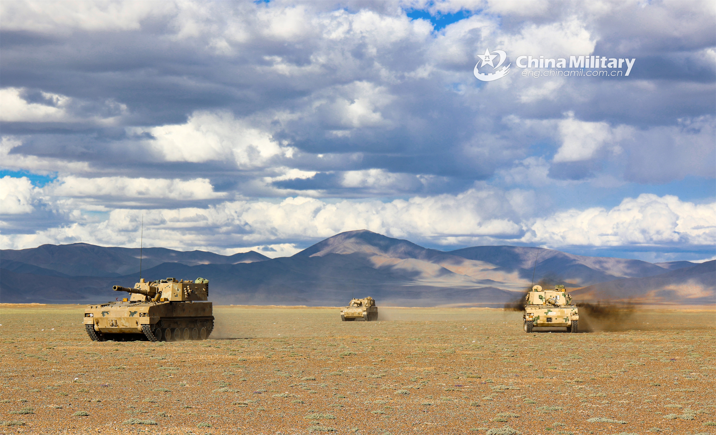 Armored vehicles attached to an army artillery element maneuver in speed en route to the designated area for a live-fire training exercise on August 21, 2023. (eng.chinamil.com.cn/Photo by Shi Jinguang)