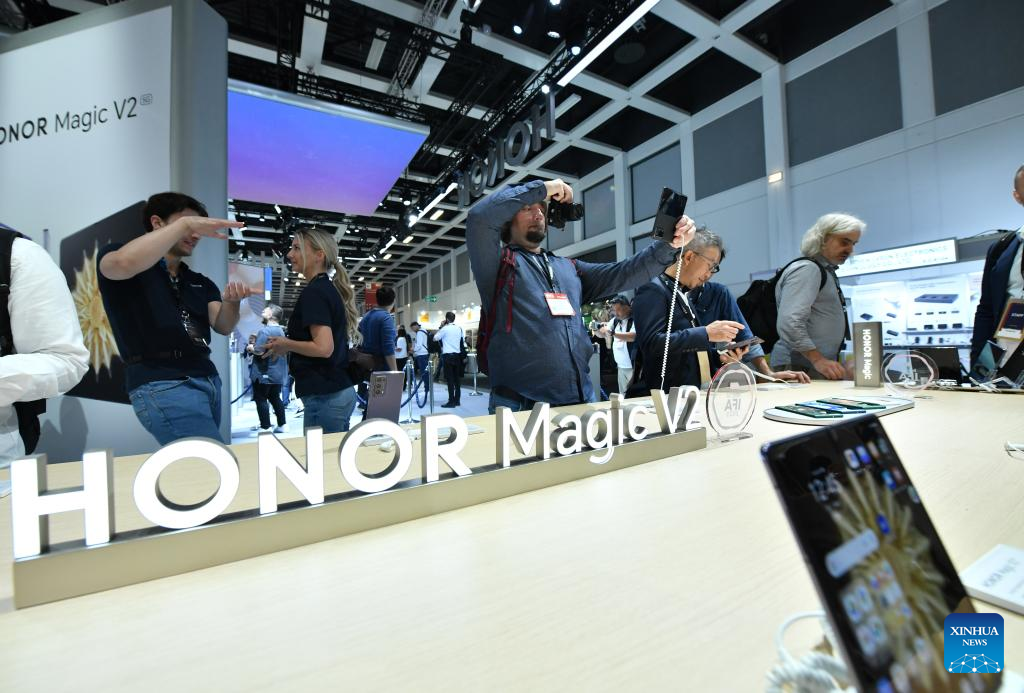 People try foldable phones at the booth of Chinese company Honor during the IFA 2023 in Berlin, capital of Germany, on Sept. 1, 2023. As one of the world's leading trade fairs for consumer electronics, the five-day IFA 2023 opened here on Friday with over 2,000 exhibitors from 48 countries and regions, a much greater scale than last year. According to IFA official website, nearly 1,300 Chinese exhibitors have registered in this year's event. Chinese companies such as Hisense, TCL and Haier have occupied some of the largest exhibit areas with various products. (Xinhua/Ren Pengfei)