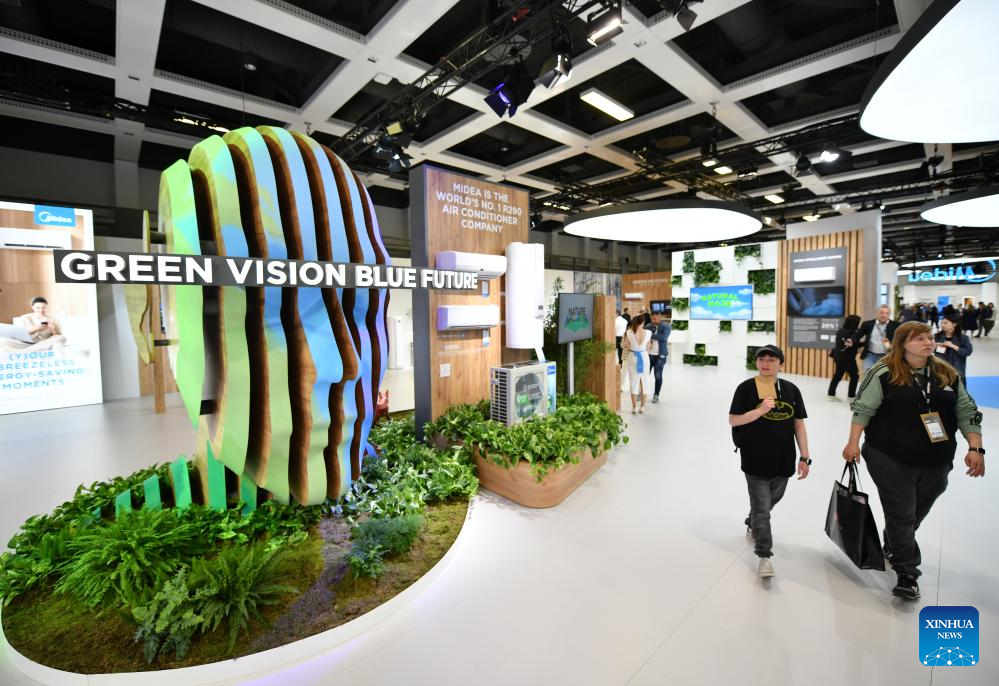 People visit the booth of China's Midea Group during the IFA 2023 in Berlin, capital of Germany, on Sept. 1, 2023. As one of the world's leading trade fairs for consumer electronics, the five-day IFA 2023 opened here on Friday with over 2,000 exhibitors from 48 countries and regions, a much greater scale than last year. According to IFA official website, nearly 1,300 Chinese exhibitors have registered in this year's event. Chinese companies such as Hisense, TCL and Haier have occupied some of the largest exhibit areas with various products. (Xinhua/Ren Pengfei)