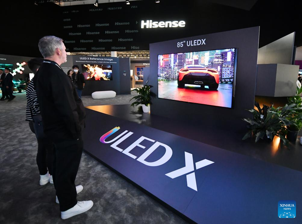 People visit the booth of Chinese company Hisense during the IFA 2023 in Berlin, capital of Germany, on Sept. 1, 2023. As one of the world's leading trade fairs for consumer electronics, the five-day IFA 2023 opened here on Friday with over 2,000 exhibitors from 48 countries and regions, a much greater scale than last year. According to IFA official website, nearly 1,300 Chinese exhibitors have registered in this year's event. Chinese companies such as Hisense, TCL and Haier have occupied some of the largest exhibit areas with various products. (Xinhua/Ren Pengfei)