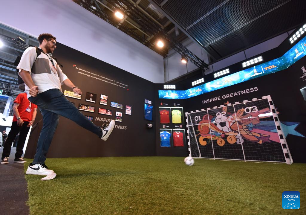 A visitor experiences a football game at the booth of Chinese company TCL during the IFA 2023 in Berlin, capital of Germany, on Sept. 1, 2023. As one of the world's leading trade fairs for consumer electronics, the five-day IFA 2023 opened here on Friday with over 2,000 exhibitors from 48 countries and regions, a much greater scale than last year. According to IFA official website, nearly 1,300 Chinese exhibitors have registered in this year's event. Chinese companies such as Hisense, TCL and Haier have occupied some of the largest exhibit areas with various products. (Xinhua/Ren Pengfei)