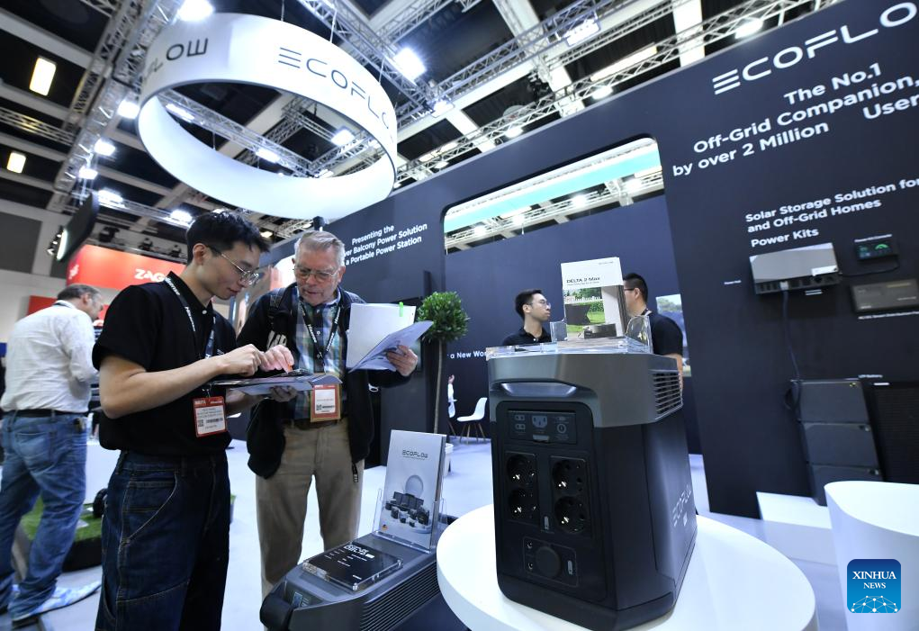 An exhibitor introduces a product to a visitor at the booth of Chinese portable power and renewable energy company EcoFlow during the IFA 2023 in Berlin, capital of Germany, on Sept. 1, 2023. As one of the world's leading trade fairs for consumer electronics, the five-day IFA 2023 opened here on Friday with over 2,000 exhibitors from 48 countries and regions, a much greater scale than last year. According to IFA official website, nearly 1,300 Chinese exhibitors have registered in this year's event. Chinese companies such as Hisense, TCL and Haier have occupied some of the largest exhibit areas with various products. (Xinhua/Ren Pengfei)
