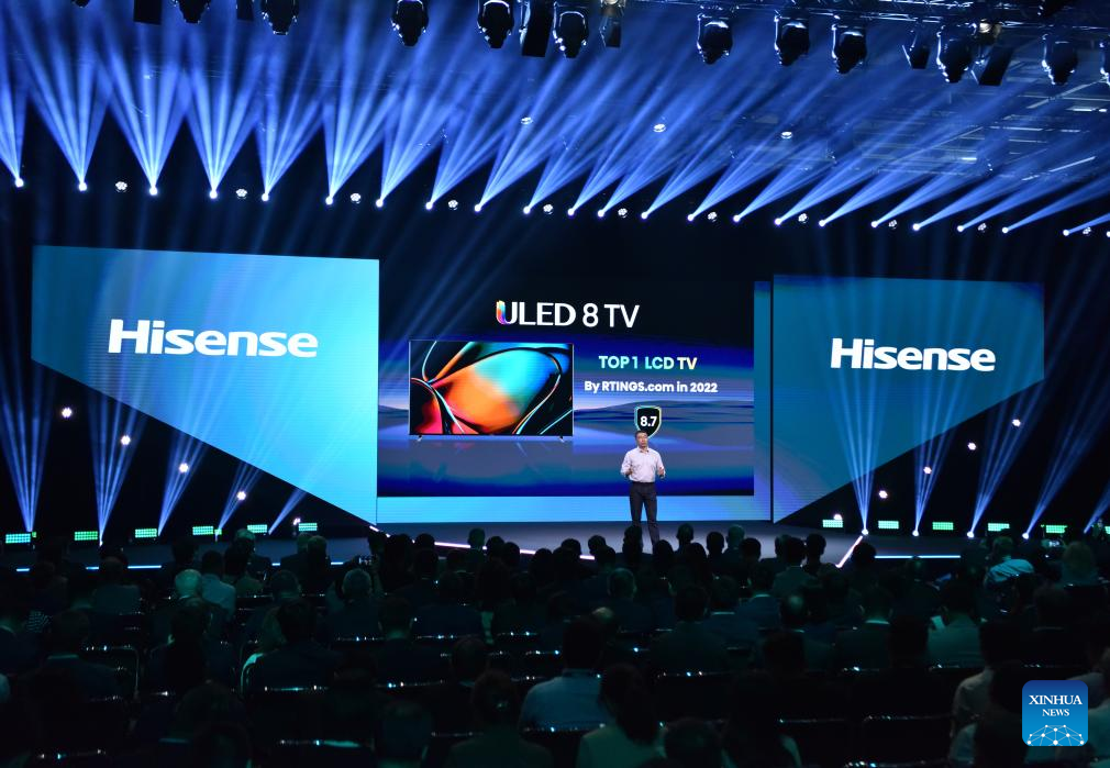 Photo taken on Sept. 1 2023 shows a press conference of Chinese company Hisense during the IFA 2023 in Berlin, capital of Germany. As one of the world's leading trade fairs for consumer electronics, the five-day IFA 2023 opened here on Friday with over 2,000 exhibitors from 48 countries and regions, a much greater scale than last year. According to IFA official website, nearly 1,300 Chinese exhibitors have registered in this year's event. Chinese companies such as Hisense, TCL and Haier have occupied some of the largest exhibit areas with various products. (Xinhua/Ren Pengfei)