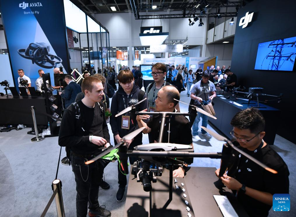 People visit the booth of Chinese company DJI during the IFA 2023 in Berlin, capital of Germany, on Sept. 1, 2023. As one of the world's leading trade fairs for consumer electronics, the five-day IFA 2023 opened here on Friday with over 2,000 exhibitors from 48 countries and regions, a much greater scale than last year. According to IFA official website, nearly 1,300 Chinese exhibitors have registered in this year's event. Chinese companies such as Hisense, TCL and Haier have occupied some of the largest exhibit areas with various products. (Xinhua/Ren Pengfei)