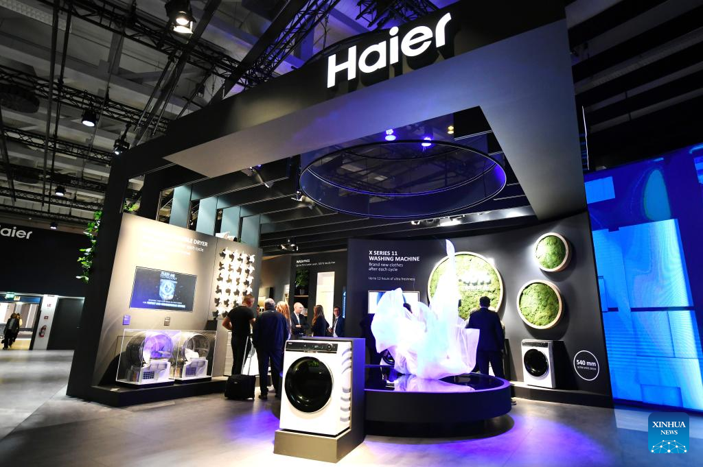 People visit the booth of Chinese company Haier during the IFA 2023 in Berlin, capital of Germany, on Sept. 1, 2023. As one of the world's leading trade fairs for consumer electronics, the five-day IFA 2023 opened here on Friday with over 2,000 exhibitors from 48 countries and regions, a much greater scale than last year. According to IFA official website, nearly 1,300 Chinese exhibitors have registered in this year's event. Chinese companies such as Hisense, TCL and Haier have occupied some of the largest exhibit areas with various products. (Xinhua/Ren Pengfei)