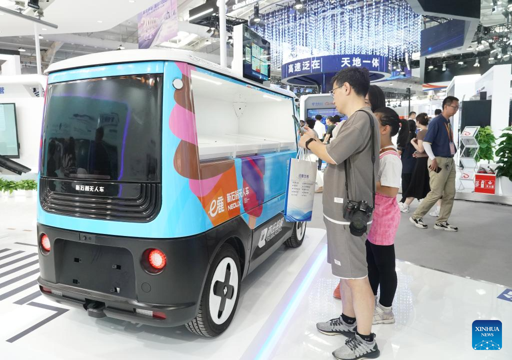 This photo shows a self-driving vehicle on display during the 2023 China International Fair for Trade in Services (CIFTIS) at Shougang Park in Beijing, capital of China, Sept. 3, 2023. (Xinhua/Zhang Chenlin)