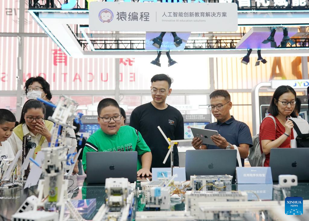 Children try coding works of smart hardware during the 2023 China International Fair for Trade in Services (CIFTIS) at Shougang Park in Beijing, capital of China, Sept. 3, 2023. (Xinhua/Zhang Chenlin)