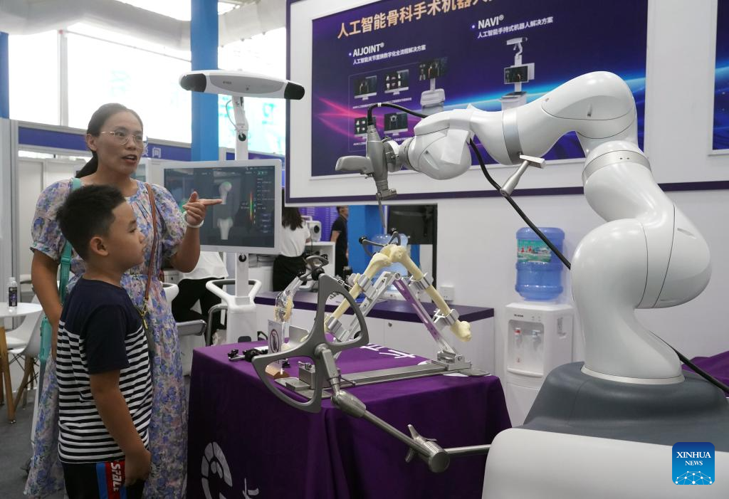 This photo shows an AI-powered orthopaedic surgical robot on display during the 2023 China International Fair for Trade in Services (CIFTIS) at Shougang Park in Beijing, capital of China, Sept. 3, 2023. (Xinhua/Ren Chao)