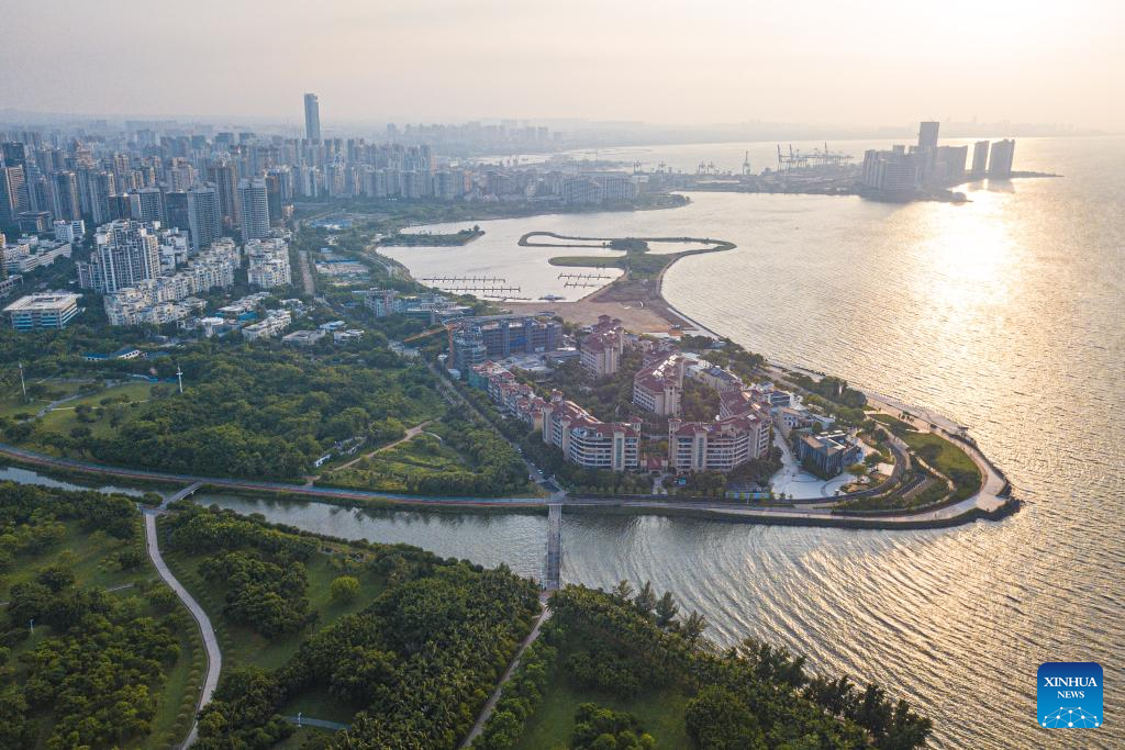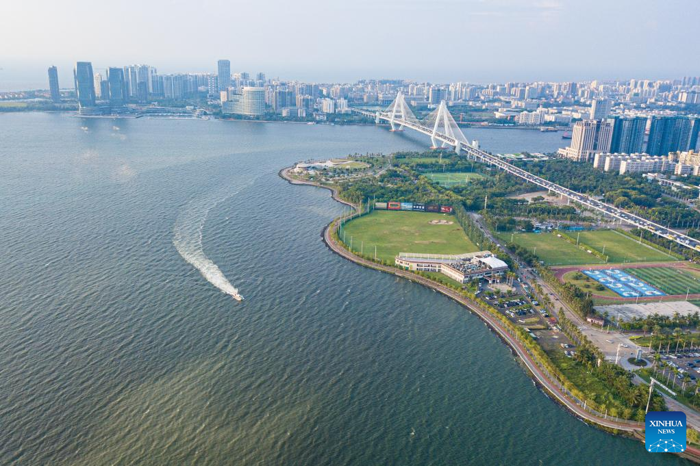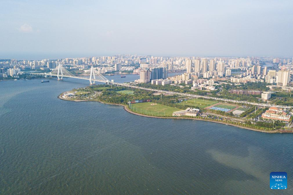 This aerial photo taken on Sept. 1, 2023 shows the scenery of Haikou Bay in Haikou, south China's Hainan Province. In recent days, China's Ministry of Ecology and Environment released the second batch of beautiful bay cases, which listed 12 cases including Haikou Bay and Sanya Bay of Hainan. A case of beautiful bay should provide graceful seaside scenery, harmonious environment, and ecological products of high quality. (Xinhua/Pu Xiaoxu)