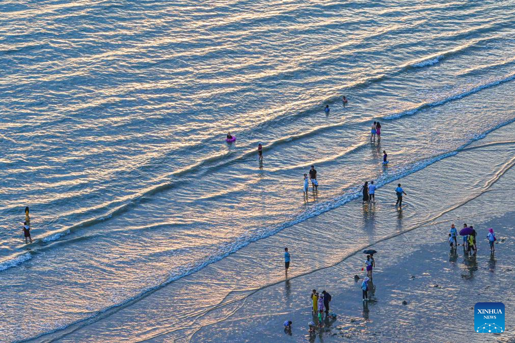 Tourists enjoy themselves by the seaside of Sanya Bay in Sanya, south China's Hainan Province, Aug. 30, 2023. In recent days, China's Ministry of Ecology and Environment released the second batch of beautiful bay cases, which listed 12 cases including Haikou Bay and Sanya Bay of Hainan. A case of beautiful bay should provide graceful seaside scenery, harmonious environment, and ecological products of high quality. (Xinhua/Pu Xiaoxu)