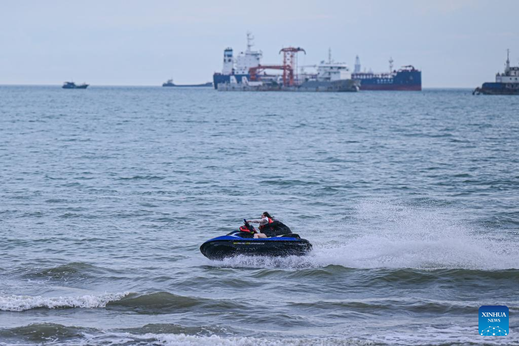 A tourist experiences a water recreation activity in Sanya Bay of Sanya, south China's Hainan Province, Aug. 30, 2023. In recent days, China's Ministry of Ecology and Environment released the second batch of beautiful bay cases, which listed 12 cases including Haikou Bay and Sanya Bay of Hainan. A case of beautiful bay should provide graceful seaside scenery, harmonious environment, and ecological products of high quality. (Xinhua/Pu Xiaoxu)