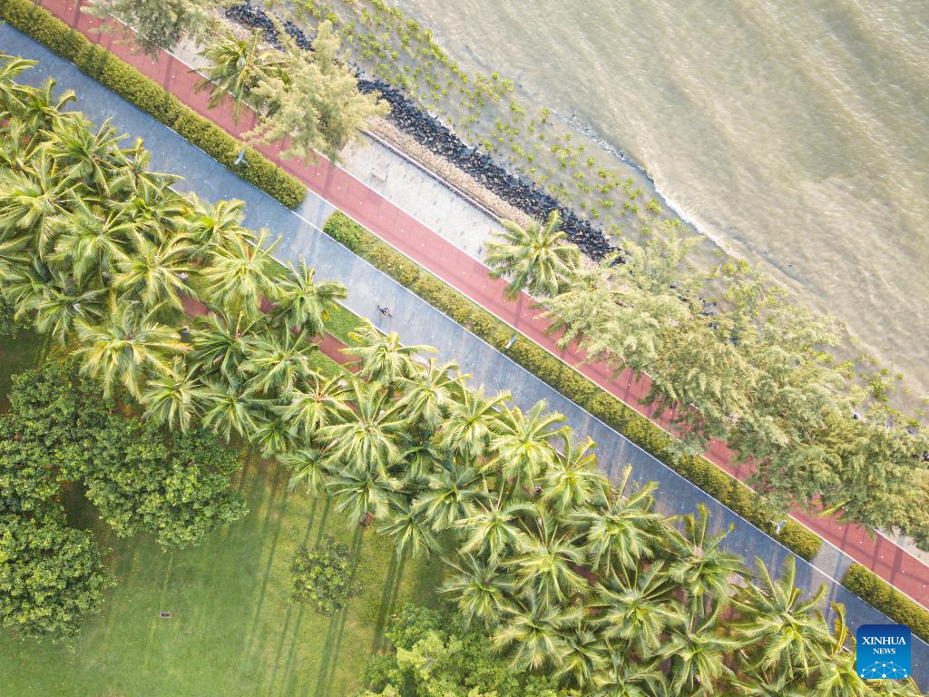 This aerial photo taken on Sept. 1, 2023 shows a tourist cycling by the seaside of Haikou Bay in Haikou, south China's Hainan Province. In recent days, China's Ministry of Ecology and Environment released the second batch of beautiful bay cases, which listed 12 cases including Haikou Bay and Sanya Bay of Hainan. A case of beautiful bay should provide graceful seaside scenery, harmonious environment, and ecological products of high quality. (Xinhua/Pu Xiaoxu)