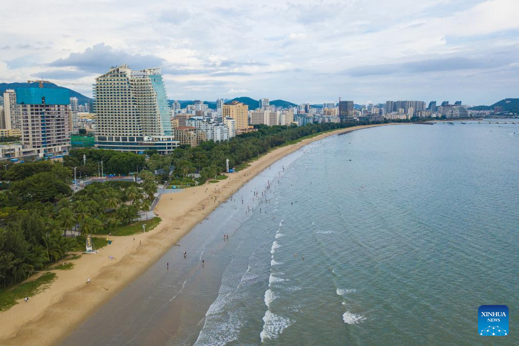 This aerial photo taken on Aug. 30, 2023 shows the scenery of Sanya Bay in Sanya, south China's Hainan Province. In recent days, China's Ministry of Ecology and Environment released the second batch of beautiful bay cases, which listed 12 cases including Haikou Bay and Sanya Bay of Hainan. A case of beautiful bay should provide graceful seaside scenery, harmonious environment, and ecological products of high quality. (Xinhua/Pu Xiaoxu)