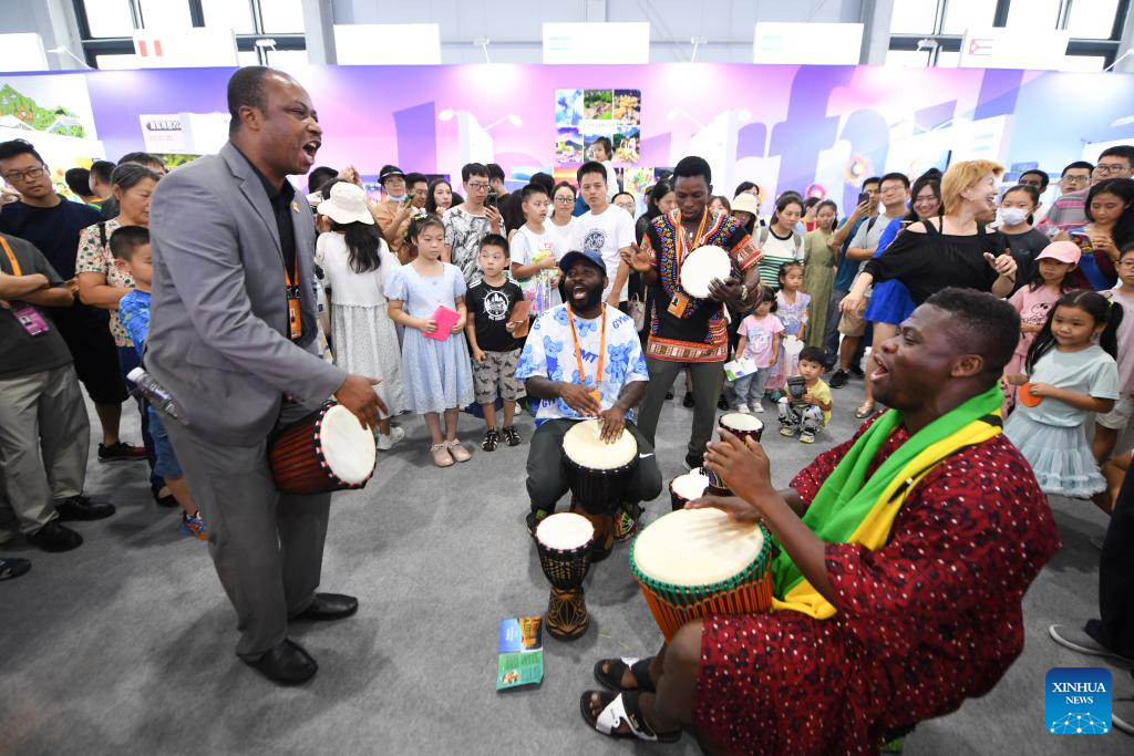 Staff members perform at an exhibition booth of the Ghanaian embassy in China at the 8th Colourful World -- Cultural Exhibition of Countries along the Belt and Road during the 2023 China International Fair for Trade in Services (CIFTIS) in Beijing, capital of China, Sept 2, 2023. [Photo/Xinhua]