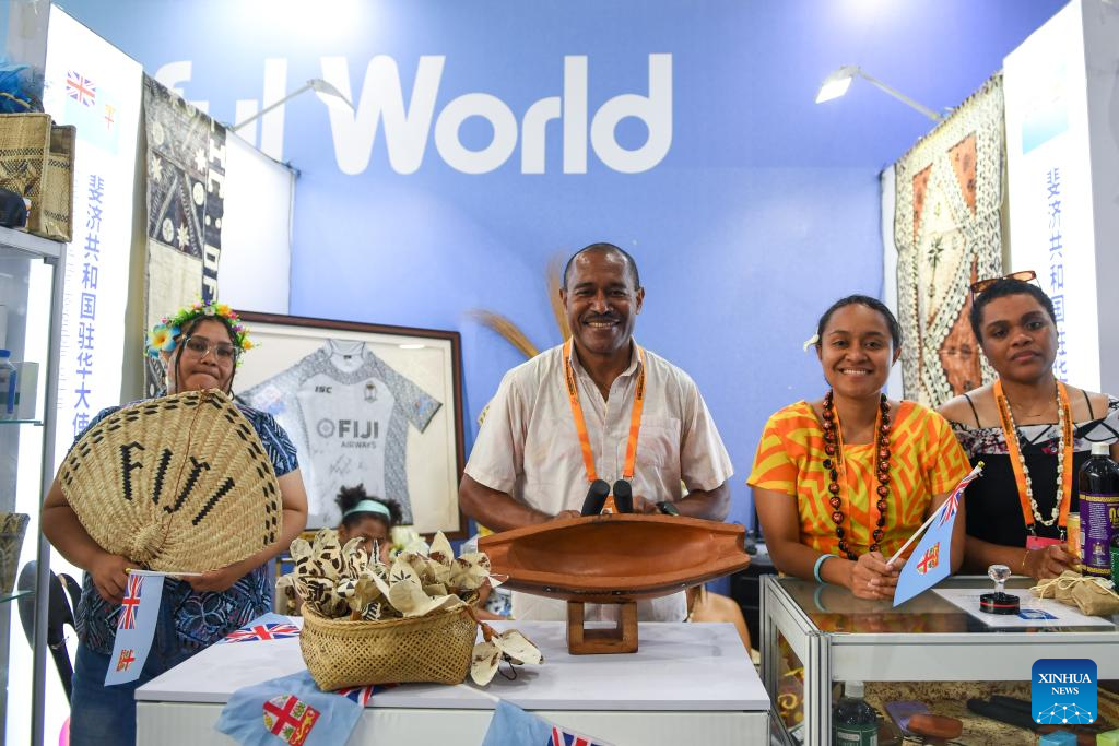 Staff members display Fijian instruments at the exhibition booth of the Fijian embassy in China at the 8th Colourful World -- Cultural Exhibition of Countries along the Belt and Road during the 2023 China International Fair for Trade in Services (CIFTIS) in Beijing, capital of China, Sept. 2, 2023. (Xinhua/Ju Huanzong)