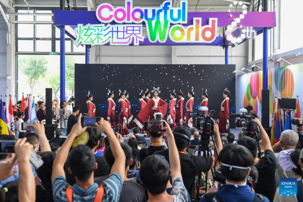Artists perform at the 8th Colourful World -- Cultural Exhibition of Countries along the Belt and Road during the 2023 China International Fair for Trade in Services (CIFTIS) in Beijing, capital of China, Sept. 2, 2023. (Xinhua/Ju Huanzong)
