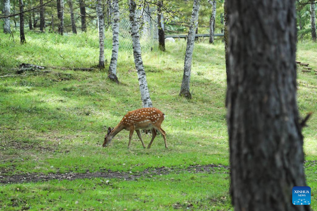 This photo taken on Aug. 31, 2023 shows a sika deer at a deer park in Arxan of Hinggan League, north China's Inner Mongolia Autonomous Region. (Xinhua/Wang Kaiyan)