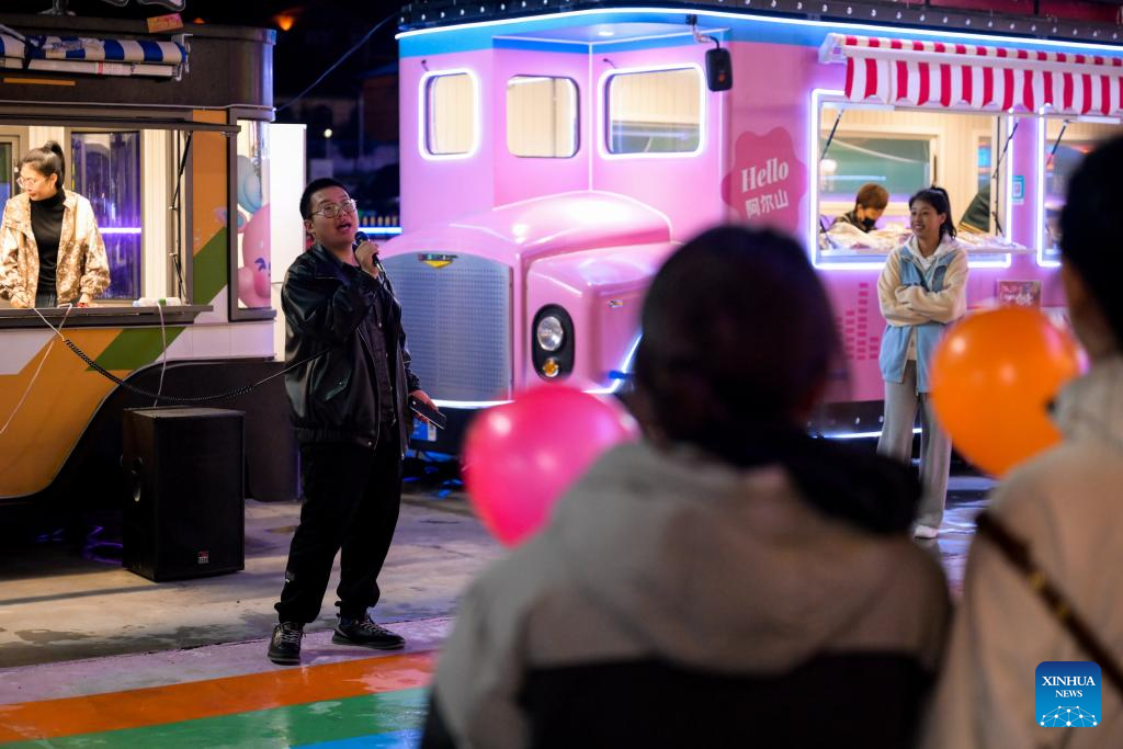 A man sings at a night market in downtown Arxan of Hinggan League, north China's Inner Mongolia Autonomous Region, Aug. 31, 2023. (Xinhua/Li Zhipeng)