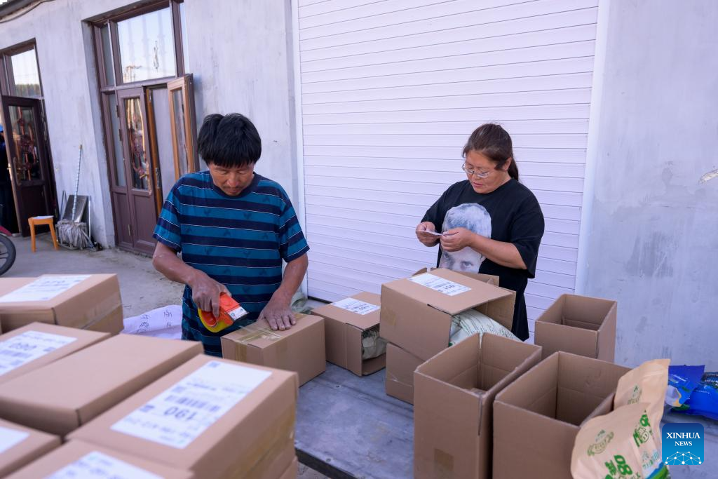 Villagers pack special local products for express deliveries at Xikou Village in Arxan of Hinggan League, north China's Inner Mongolia Autonomous Region, Sept. 2, 2023. (Xinhua/Li Zhipeng)