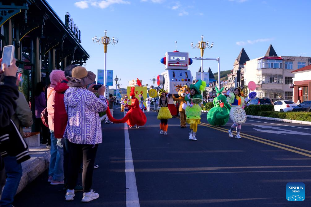 Tourists watch a float parade at downtown Arxan in Hinggan League, north China's Inner Mongolia Autonomous Region, Sept. 1, 2023. (Xinhua/Li Zhipeng)