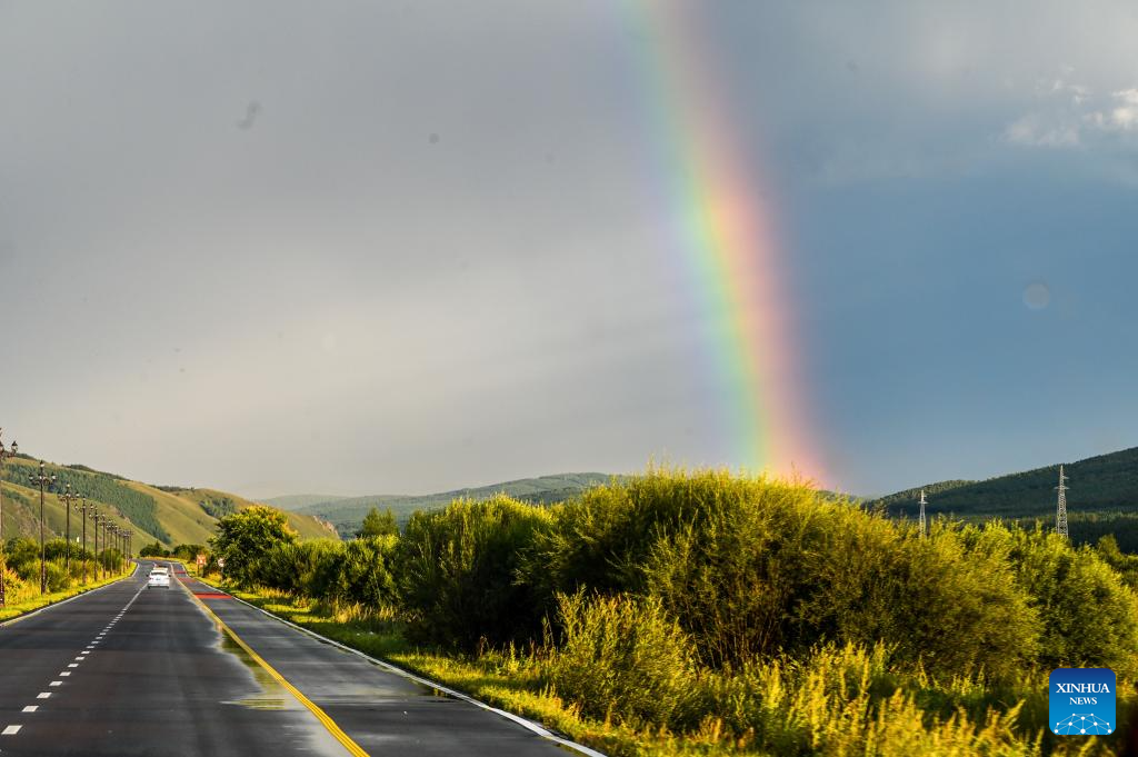 This photo taken on Aug. 31, 2023 shows the scenery of a rainbow in Arxan of Hinggan League, north China's Inner Mongolia Autonomous Region. (Xinhua/Lian Zhen)