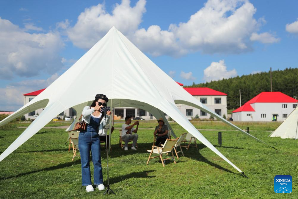 Tourists take pictures at a resort in Arxan of Hinggan League, north China's Inner Mongolia Autonomous Region, Sept. 1, 2023. (Xinhua/Wang Kaiyan)