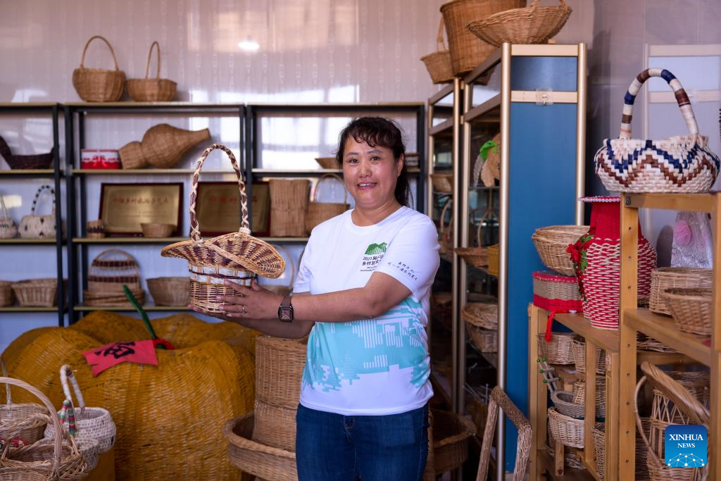Villager Dong Yali displays willow wares at Xikou Village in Arxan of Hinggan League, north China's Inner Mongolia Autonomous Region, Sept. 2, 2023. (Xinhua/Li Zhipeng)