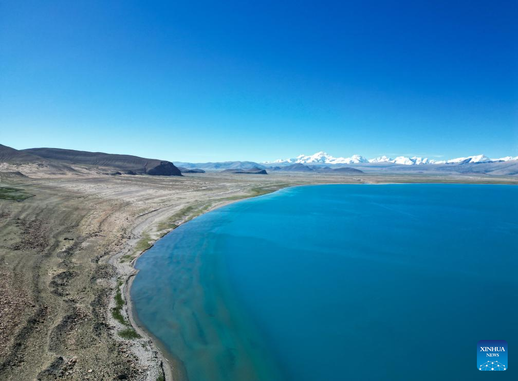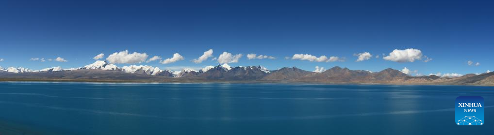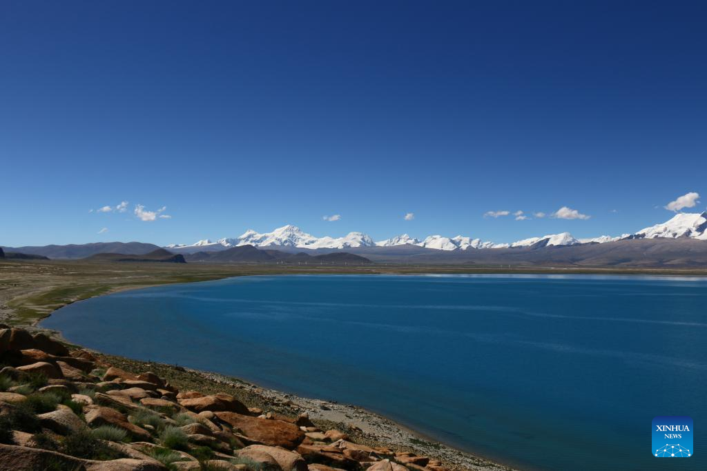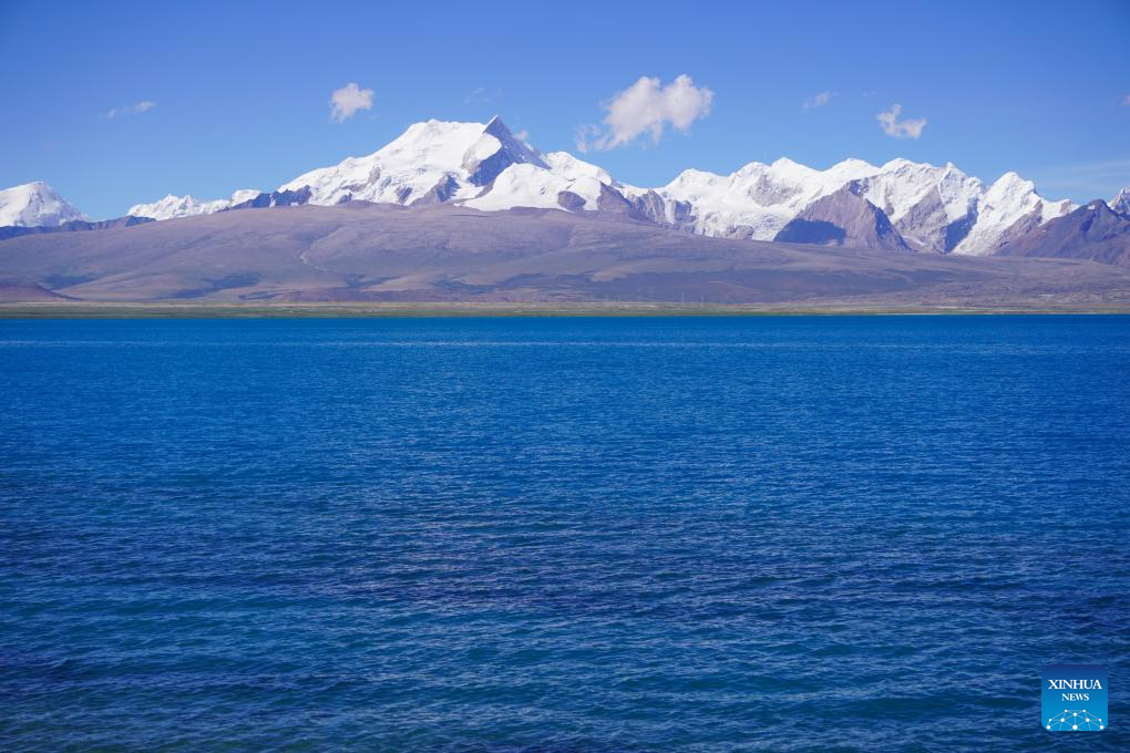 This photo taken on Sept. 2, 2023 shows the scenery of Baiku Lake and nearby snow mountains in Xigaze, southwest China's Tibet Autonomous Region. (Xinhua/Li Jian)