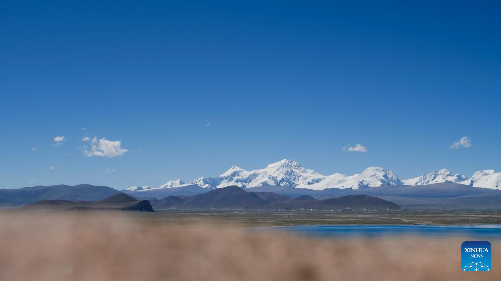 This photo taken on Sept. 2, 2023 shows the scenery of Mount Shishapangma seen from Baiku Lake in Xigaze, southwest China's Tibet Autonomous Region. (Xinhua/Chen Zepeng)