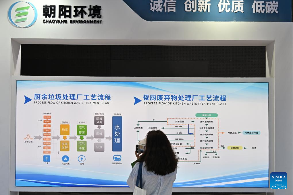 A visitor learns about the process flow of kitchen waste treatment plant at the environmental services exhibition during the 2023 China International Fair for Trade in Services (CIFTIS) in Beijing, capital of China, Sept. 2, 2023. Themed "Opening-up leads development, cooperation delivers the future," the 2023 CIFTIS is being held in Beijing from Sept. 2 to 6 and features over 200 varied events, including forums, negotiations, and summits. The green and low-carbon drive is a major feature of the event, which has several related themed forums and exhibitions of cutting-edge green services, technologies, and business models. (Xinhua/Li Xin)