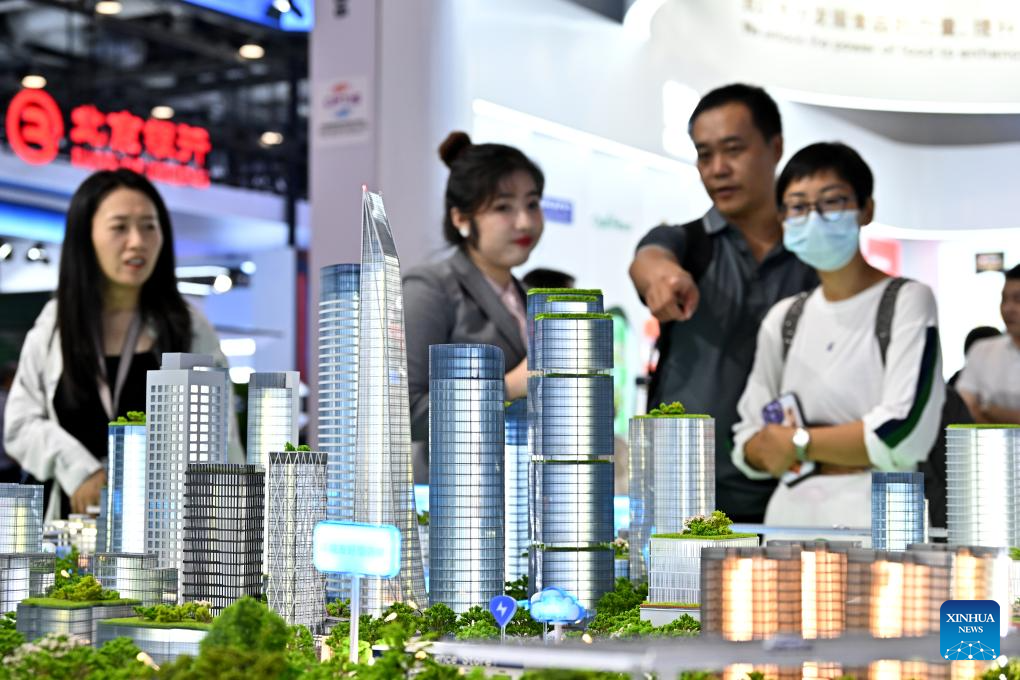 Visitors look at a sandbox model of "smart city" solution at the environmental services exhibition of the 2023 China International Fair for Trade in Services (CIFTIS) in Beijing, capital of China, Sept. 2, 2023. Themed "Opening-up leads development, cooperation delivers the future," the 2023 CIFTIS is being held in Beijing from Sept. 2 to 6 and features over 200 varied events, including forums, negotiations, and summits. The green and low-carbon drive is a major feature of the event, which has several related themed forums and exhibitions of cutting-edge green services, technologies, and business models. (Xinhua/Li Xin)