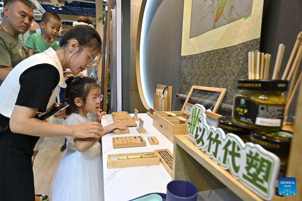 Visitors try mouse and keyboard made of bamboo at the environmental services exhibition of the 2023 China International Fair for Trade in Services (CIFTIS) in Beijing, capital of China, Sept. 2, 2023. Themed "Opening-up leads development, cooperation delivers the future," the 2023 CIFTIS is being held in Beijing from Sept. 2 to 6 and features over 200 varied events, including forums, negotiations, and summits. The green and low-carbon drive is a major feature of the event, which has several related themed forums and exhibitions of cutting-edge green services, technologies, and business models. (Xinhua/Li Xin)
