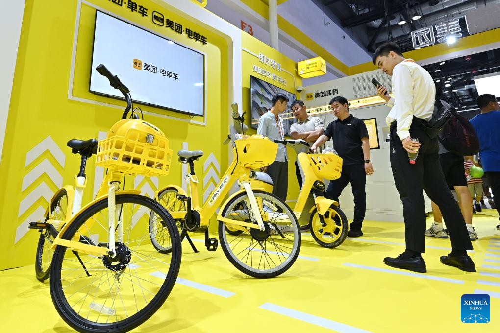 Visitors learn about various bike sharing service solutions at the environmental services exhibition of the 2023 China International Fair for Trade in Services (CIFTIS) in Beijing, capital of China, Sept. 2, 2023. Themed "Opening-up leads development, cooperation delivers the future," the 2023 CIFTIS is being held in Beijing from Sept. 2 to 6 and features over 200 varied events, including forums, negotiations, and summits. The green and low-carbon drive is a major feature of the event, which has several related themed forums and exhibitions of cutting-edge green services, technologies, and business models. (Xinhua/Li Xin)
