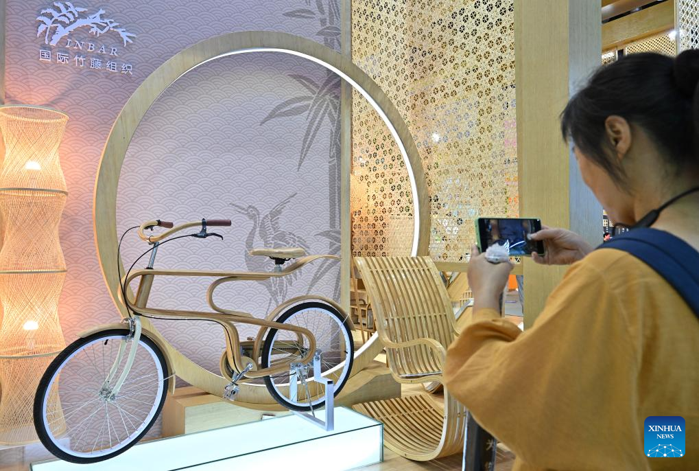 A visitor takes photos of a bicycle made of bamboo at the environmental services exhibition of the 2023 China International Fair for Trade in Services (CIFTIS) in Beijing, capital of China, Sept. 2, 2023. Themed "Opening-up leads development, cooperation delivers the future," the 2023 CIFTIS is being held in Beijing from Sept. 2 to 6 and features over 200 varied events, including forums, negotiations, and summits. The green and low-carbon drive is a major feature of the event, which has several related themed forums and exhibitions of cutting-edge green services, technologies, and business models. (Xinhua/Li Xin)