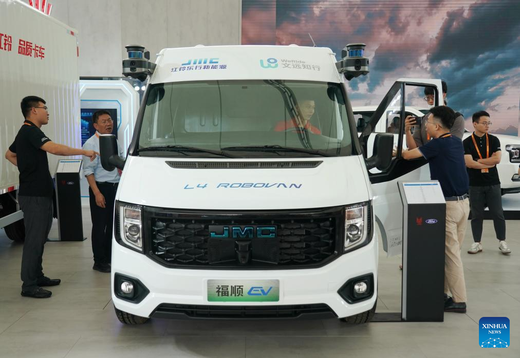 Visitors view an L4-level auto-pilot truck at the environmental services exhibition of the 2023 China International Fair for Trade in Services (CIFTIS) in Beijing, capital of China, Sept. 2, 2023. Themed "Opening-up leads development, cooperation delivers the future," the 2023 CIFTIS is being held in Beijing from Sept. 2 to 6 and features over 200 varied events, including forums, negotiations, and summits. The green and low-carbon drive is a major feature of the event, which has several related themed forums and exhibitions of cutting-edge green services, technologies, and business models. (Xinhua/Zhang Chenlin)