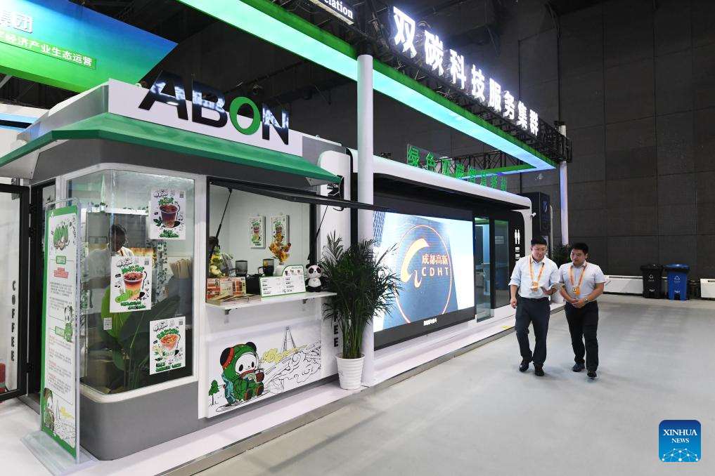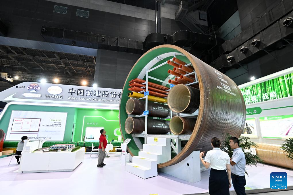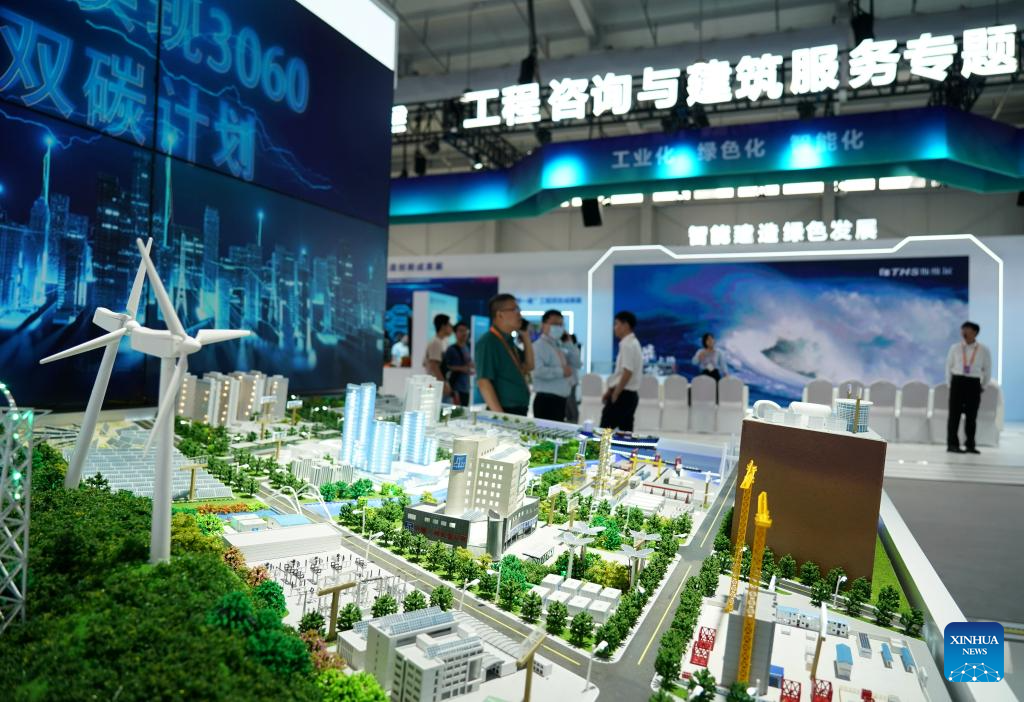 This photo taken on Sept. 2, 2023 shows the environmental services exhibition of the 2023 China International Fair for Trade in Services (CIFTIS) in Beijing, capital of China. Themed "Opening-up leads development, cooperation delivers the future," the 2023 CIFTIS is being held in Beijing from Sept. 2 to 6 and features over 200 varied events, including forums, negotiations, and summits. The green and low-carbon drive is a major feature of the event, which has several related themed forums and exhibitions of cutting-edge green services, technologies, and business models. (Xinhua/Ren Chao)