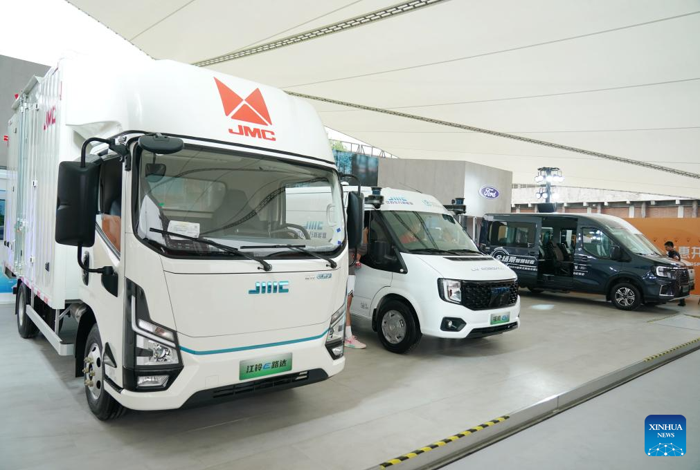 New energy vehicles are exhibited at the environmental services exhibition of the 2023 China International Fair for Trade in Services (CIFTIS) in Beijing, capital of China, Sept. 2, 2023. Themed "Opening-up leads development, cooperation delivers the future," the 2023 CIFTIS is being held in Beijing from Sept. 2 to 6 and features over 200 varied events, including forums, negotiations, and summits. The green and low-carbon drive is a major feature of the event, which has several related themed forums and exhibitions of cutting-edge green services, technologies, and business models. (Xinhua/Zhang Chenlin)