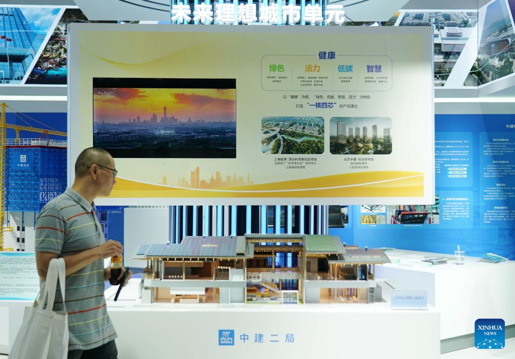 A visitor views a future city-themed exhibition booth at the environmental services exhibition of the 2023 China International Fair for Trade in Services (CIFTIS) in Beijing, capital of China, Sept. 2, 2023. Themed "Opening-up leads development, cooperation delivers the future," the 2023 CIFTIS is being held in Beijing from Sept. 2 to 6 and features over 200 varied events, including forums, negotiations, and summits. The green and low-carbon drive is a major feature of the event, which has several related themed forums and exhibitions of cutting-edge green services, technologies, and business models. (Xinhua/Zhang Chenlin)