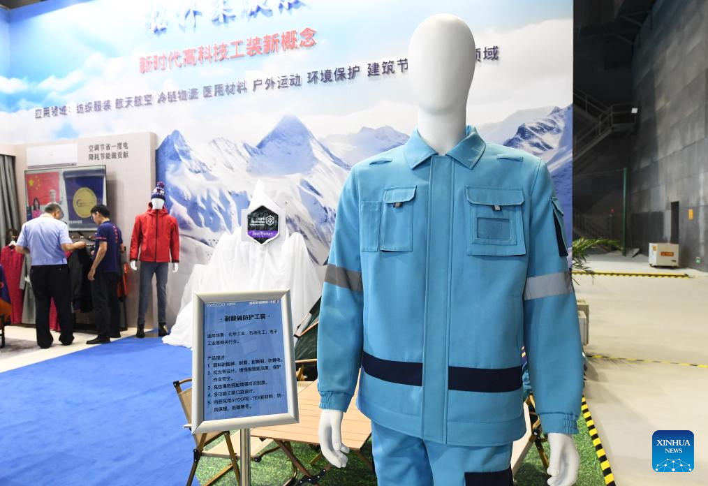 An acid and alkali resistant overall is exhibited at the environmental services exhibition of the 2023 China International Fair for Trade in Services (CIFTIS) in Beijing, capital of China, Sept. 2, 2023. Themed "Opening-up leads development, cooperation delivers the future," the 2023 CIFTIS is being held in Beijing from Sept. 2 to 6 and features over 200 varied events, including forums, negotiations, and summits. The green and low-carbon drive is a major feature of the event, which has several related themed forums and exhibitions of cutting-edge green services, technologies, and business models. (Xinhua/Ren Chao)