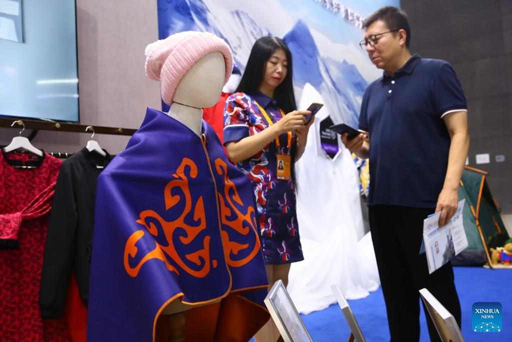 A trader learns about clothing products made of new materials at the environmental services exhibition of the 2023 China International Fair for Trade in Services (CIFTIS) in Beijing, capital of China, Sept. 2, 2023. Themed "Opening-up leads development, cooperation delivers the future," the 2023 CIFTIS is being held in Beijing from Sept. 2 to 6 and features over 200 varied events, including forums, negotiations, and summits. The green and low-carbon drive is a major feature of the event, which has several related themed forums and exhibitions of cutting-edge green services, technologies, and business models. (Xinhua/Sun Weitong)