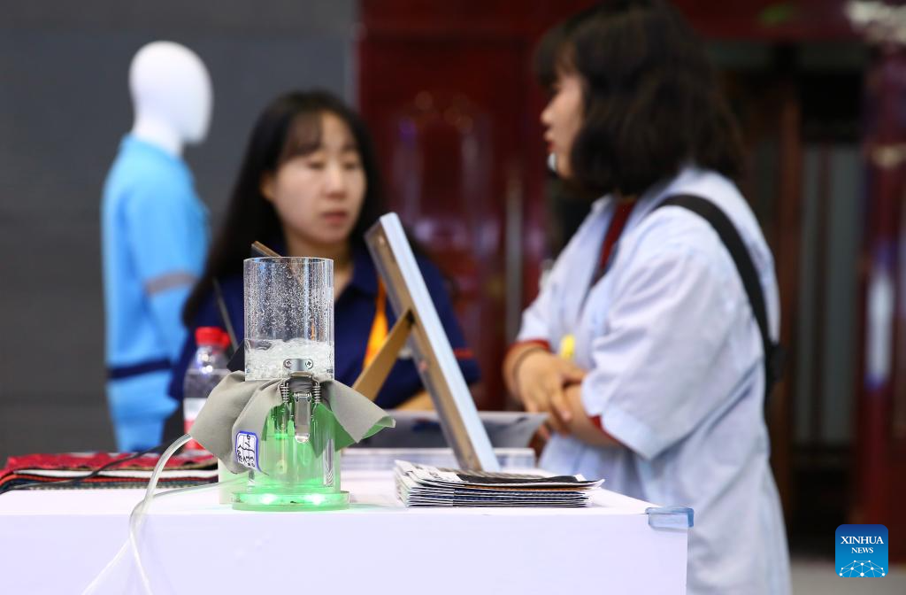 A visitor learns about topological softgel, a new material which can be applied in textiles, at the environmental services exhibition of the 2023 China International Fair for Trade in Services (CIFTIS) in Beijing, capital of China, Sept. 2, 2023. Themed "Opening-up leads development, cooperation delivers the future," the 2023 CIFTIS is being held in Beijing from Sept. 2 to 6 and features over 200 varied events, including forums, negotiations, and summits. The green and low-carbon drive is a major feature of the event, which has several related themed forums and exhibitions of cutting-edge green services, technologies, and business models. (Xinhua/Sun Weitong)