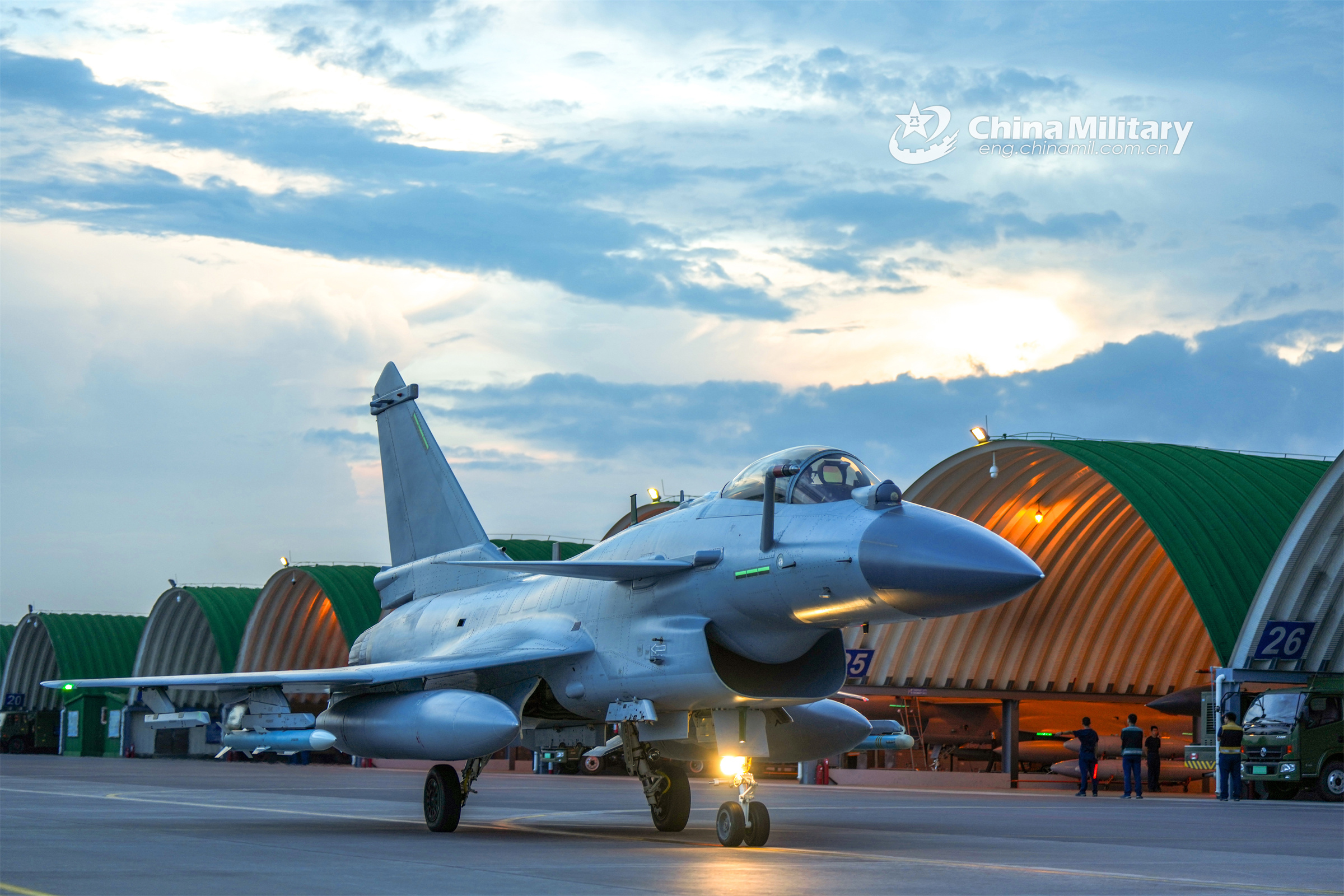 A J-10 fighter jet attached to an aviation brigade of the air force under the PLA Southern Theater Command taxies out of hangar during a round-the-clock flight training exercise on August 13, 2023. (eng.chinamil.com.cn/Photo by Wang Guoyun)