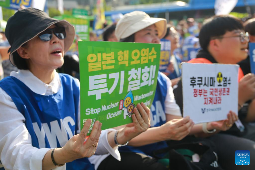 SEOUL, Sept. 2 (Xinhua) -- Thousands of South Korean people including fishermen, activists and politicians continued a weekend rally in central Seoul on Saturday to protest against Japan's dumping of nuclear-contaminated wastewater into the ocean.