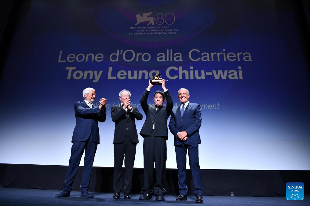Actor Tony Leung Chiu-Wai (2nd, R) poses with his trophy at an award ceremony during the 80th Venice International Film Festival in Venice, Italy, on Sept. 2, 2023. Tony Leung Chiu-Wai of Hong Kong, China was presented with the Golden Lion for Lifetime Achievement during the event on Saturday. (Xinhua/Jin Mamengni)