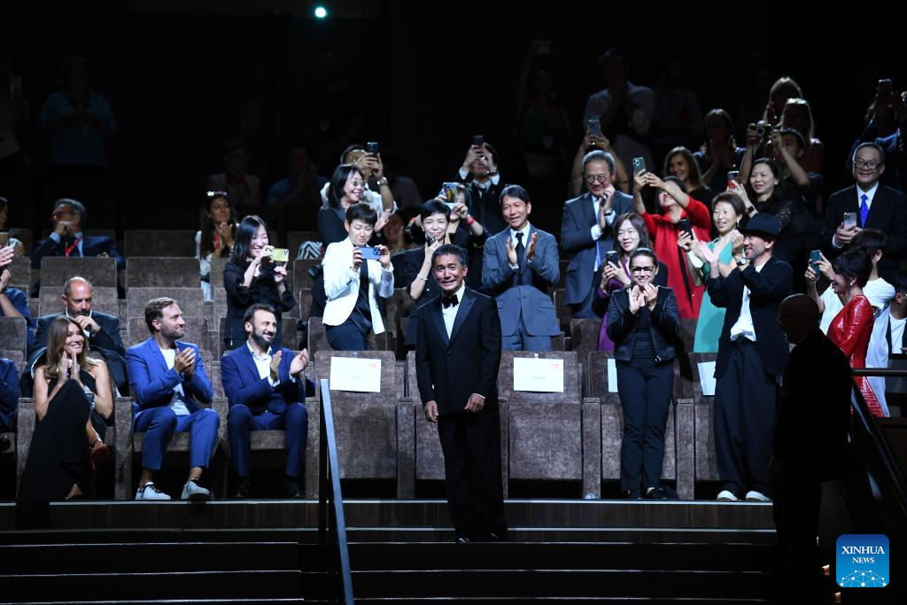 Actor Tony Leung Chiu-Wai greets the audience at an award ceremony during the 80th Venice International Film Festival in Venice, Italy, on Sept. 2, 2023. Tony Leung Chiu-Wai of Hong Kong, China was presented with the Golden Lion for Lifetime Achievement during the event on Saturday. (Xinhua/Jin Mamengni)